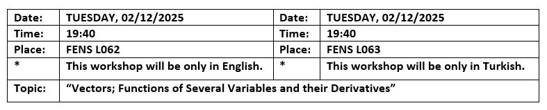 The second of these workshops is on “Vectors; Functions of Several Variables and their Derivatives”. This review will help you with your current course material.